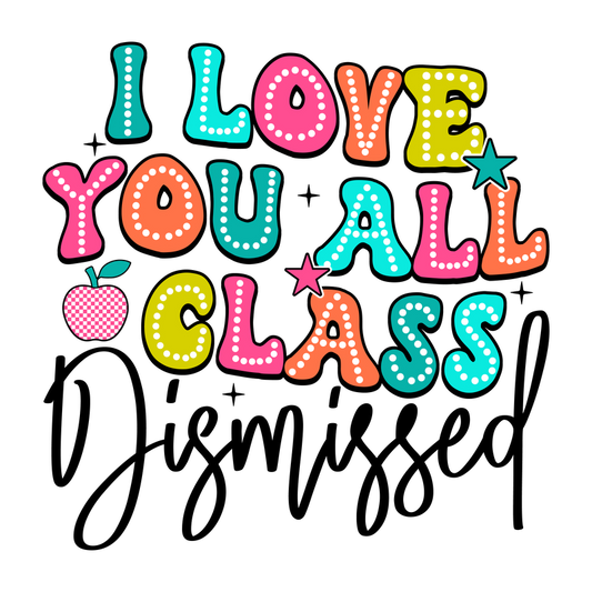 A vibrant and cheerful design featuring the phrase "I Love You All Class" with playful letters and a cute apple graphic, perfect for teachers!DTF Transfers