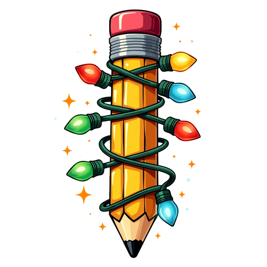 A playful yellow pencil is wrapped in colorful Christmas lights, adding a festive touch to a classic school supply!DTF Transfers