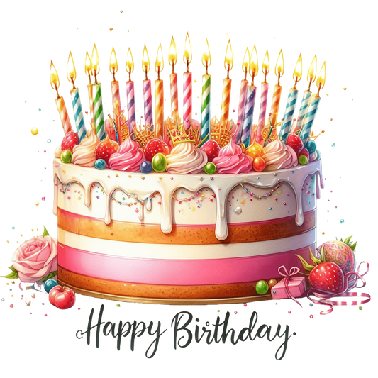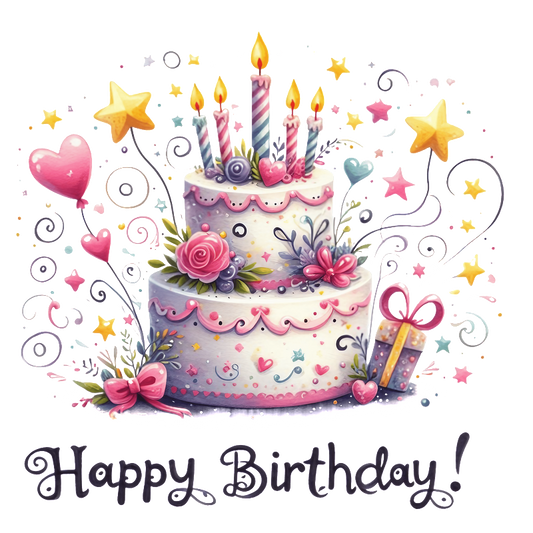 Celebrate with a beautifully decorated birthday cake featuring colorful candles, roses, and festive stars, spreading joyful wishes!DTF Transfers