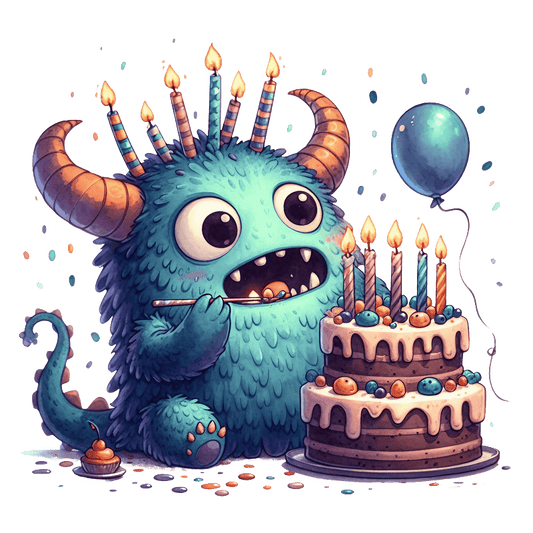 A cute, fluffy blue monster celebrates a birthday with a delicious multi-layered cake topped with colorful candles and decorations.DTF Transfers
