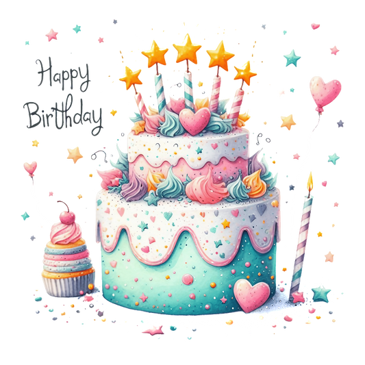 Celebrate with this delightful birthday cake featuring colorful frosting, stars, and candles, accompanied by a matching cupcake!DTF Transfers