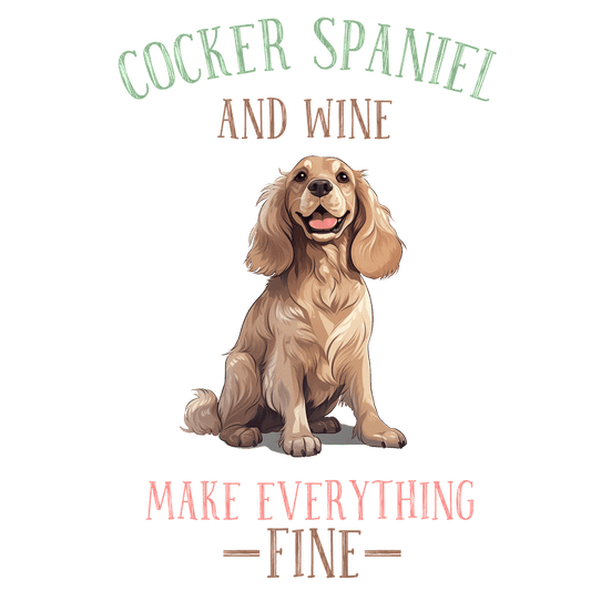 A cheerful Cocker Spaniel illustration accompanied by the playful phrase "Cocker Spaniel and wine make everything fine."DTF Transfers