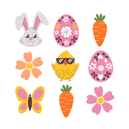 A vibrant collection of Easter-themed icons including a bunny, decorated eggs, a cool chick, flowers, and carrots.DTF Transfers