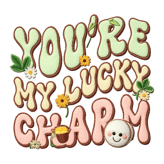 《3D chenille-like》Colorful and cheerful "YOU'RE MY LUCKY CHARM" graphic with flowers and smiling character.DTF Transfers