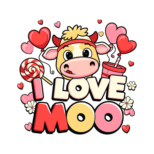 Cute cow face with "I Love Moo" text and heart-shaped lollipops.DTF Transfers