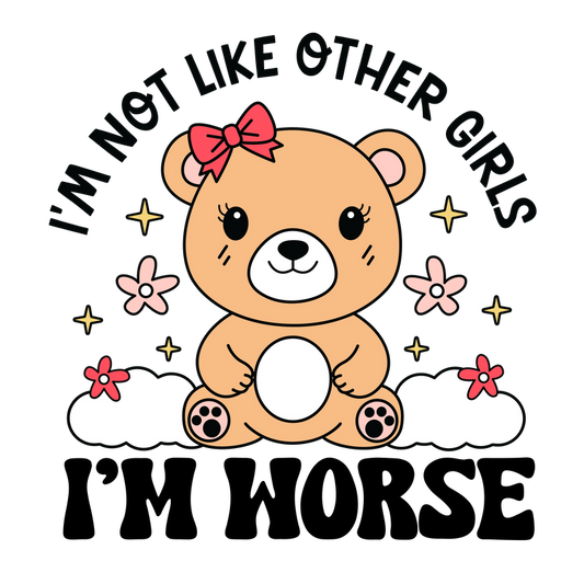 Precio habitual A partir de £0.75 GBPPrecio habitualPrecio unitario / por£2.40 GBPPrecio de oferta A partir de £0.75 GBPCute bear graphic tee with text "I'm not like other girls."DTF Transfers
