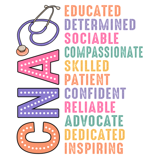 A vibrant design showcasing key qualities of CNAs, emphasizing traits like educated, compassionate, and patient alongside playful typography.DTF Transfers
