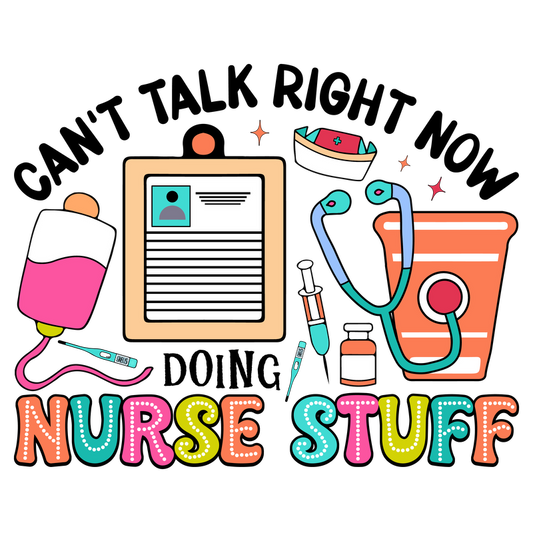 A vibrant graphic featuring essential nursing tools like a stethoscope, syringe, IV bag, and medical chart, labeled “Nurse Stuff.”DTF Transfers