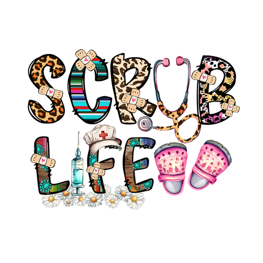 Colorful and playful "Scrub Life" design featuring medical themes, including a stethoscope, syringe, and fun printed clogs.DTF Transfers