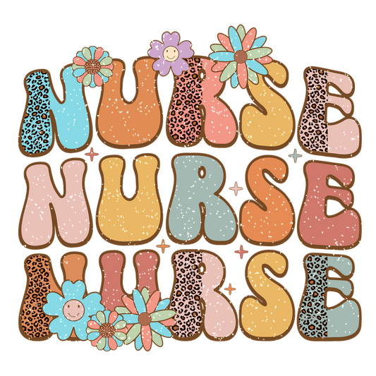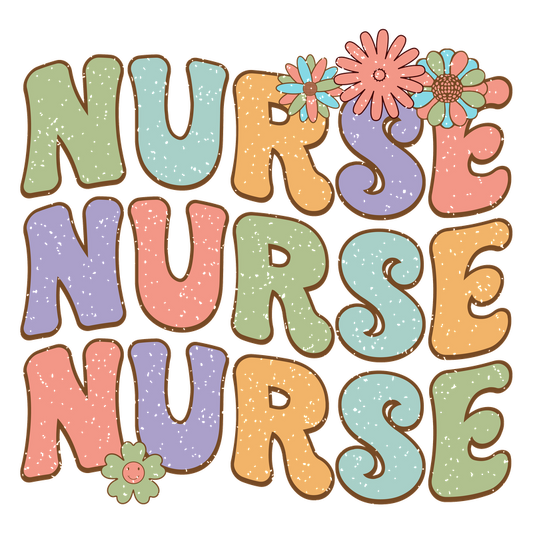 Cheerful "NURSE" design featuring playful letters, vibrant colors, and cute floral elements to celebrate the nursing profession!DTF Transfers
