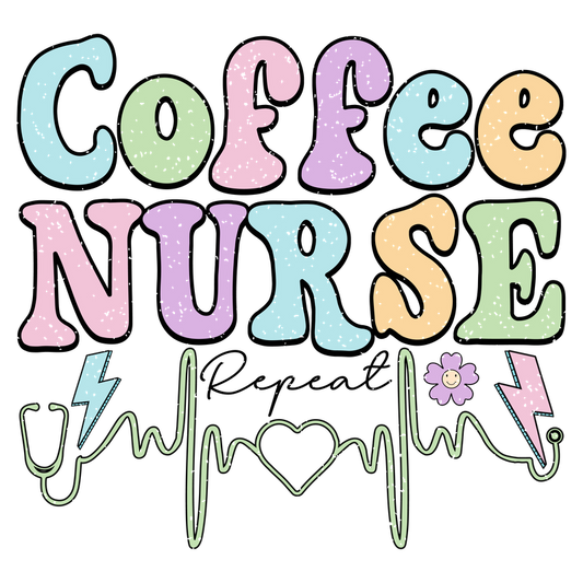 A vibrant graphic featuring playful lettering that reads "Coffee Nurse," complemented by medical symbols and a cheerful flower.DTF Transfers