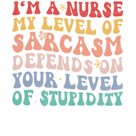 A playful and colorful graphic design featuring the humorous quote about nursing, sarcasm, and intelligence levels, perfect for nurses.DTF Transfers