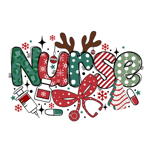 A festive design featuring the word "Nurse" with playful holiday elements like reindeer antlers, Christmas trees, and vibrant colors.DTF Transfers