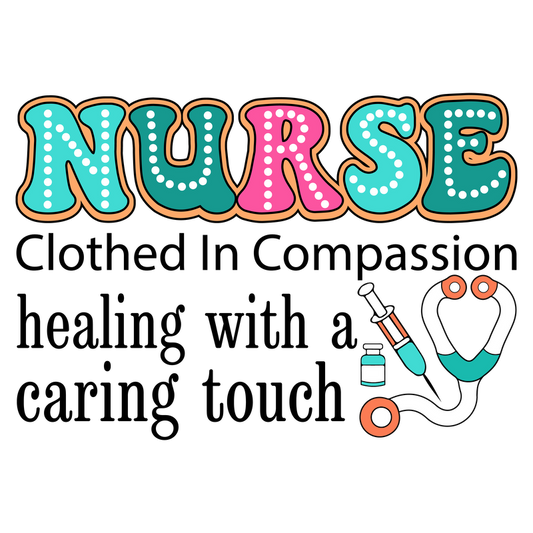 A colorful and playful design featuring the word "NURSE," accompanied by medical symbols like a syringe, vial, and stethoscope.DTF Transfers
