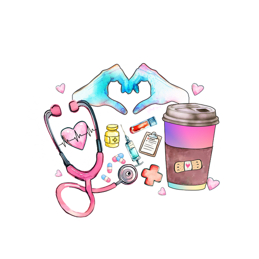 A vibrant illustration featuring hands forming a heart, surrounded by medical items, a coffee cup, and colorful hearts.DTF Transfers