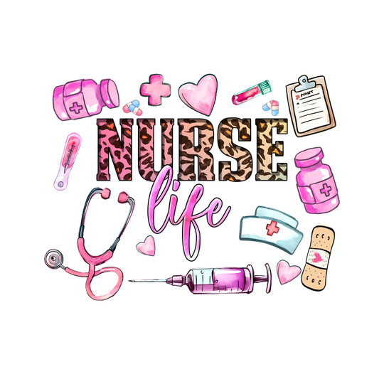A vibrant and fun design celebrating "Nurse Life," featuring medical equipment, playful colors, and a stylish leopard print text.DTF Transfers