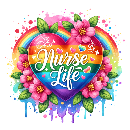 A vibrant, rainbow heart adorned with flowers and the phrase "Nurse Life," celebrating the spirit of nursing.DTF Transfers