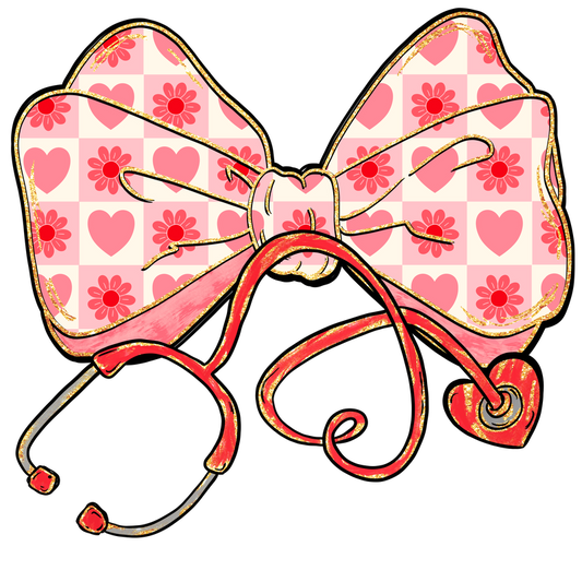 A charming illustration of a pink checkered bow adorned with hearts and flowers, intertwined with a stethoscope.DTF Transfers