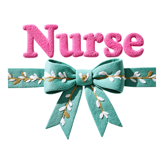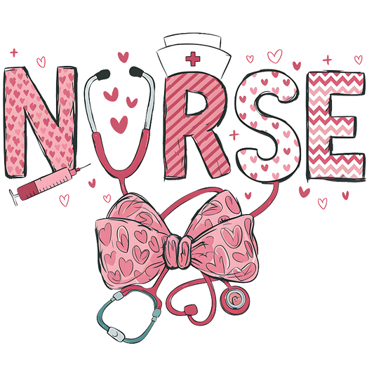 A vibrant and playful design featuring the word "NURSE" with hearts, a stethoscope, and a pink bow.DTF Transfers