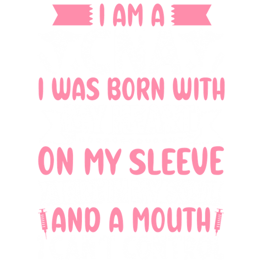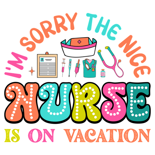 A colorful and playful graphic that humorously announces “I’m sorry, the nice nurse is on vacation,” featuring medical icons and vibrant typography.DTF Transfers