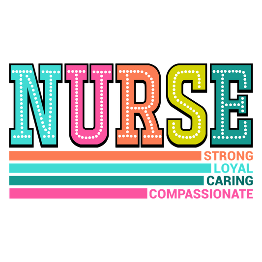 Celebrate the nursing profession with this colorful design highlighting the traits: Strong, Loyal, Caring, and Compassionate.DTF Transfers