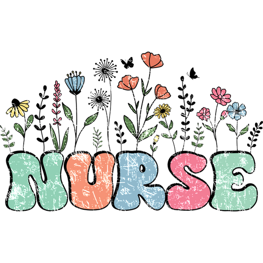 Colorful and playful "NURSE" design featuring a variety of flowers, perfect for celebrating the nursing profession.DTF Transfers