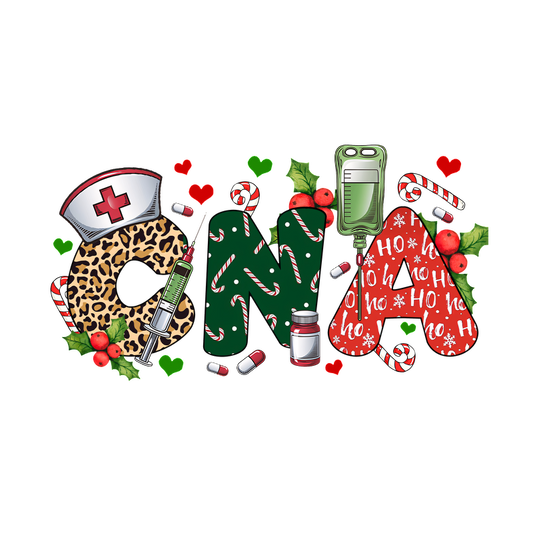 A vibrant holiday-themed design featuring the letters "CNA" adorned with festive elements like candy canes and a nurse's cap.DTF Transfers