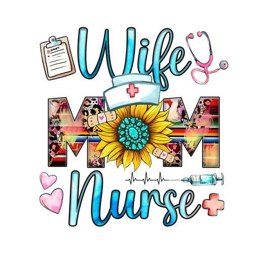 A vibrant design celebrating the roles of wife, mom, and nurse, featuring a sunflower, stethoscope, and playful graphics.DTF Transfers
