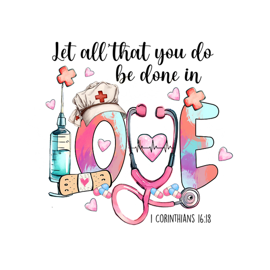 A colorful and playful design featuring medical symbols like a stethoscope, syringe, and nurse's hat, expressing love for healthcare.DTF Transfers