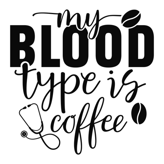 A whimsical design stating "My Blood Type is Coffee," perfect for coffee lovers with playful elements like a coffee bean and stethoscope.DTF Transfers