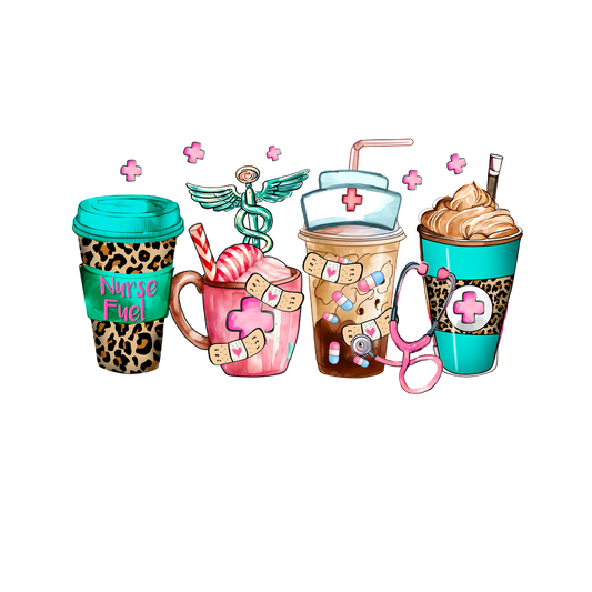 A fun collection of nurse-themed beverage cups, featuring vibrant colors, playful patterns, and medical motifs like band-aids and caduceus.DTF Transfers