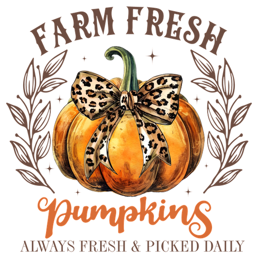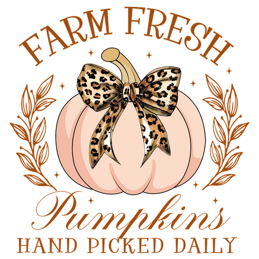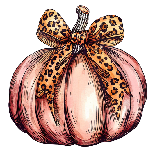 Un gráfico elegante que presenta una calabaza rosa suave adornada con un lazo con estampado de leopardo, que resalta las calabazas frescas seleccionadas a mano.