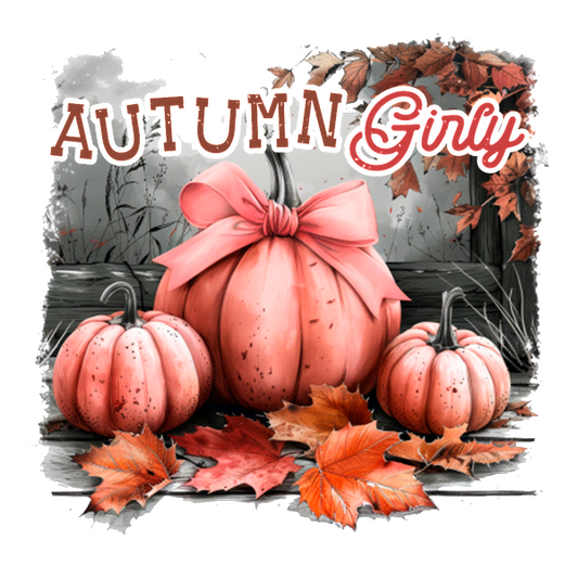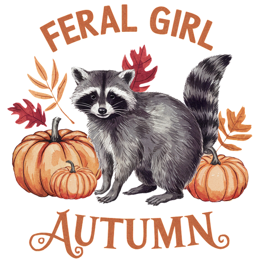 Diseño otoñal caprichoso que presenta un encantador mapache rodeado de calabazas y hojas otoñales, con el texto "Feral Girl Autumn".