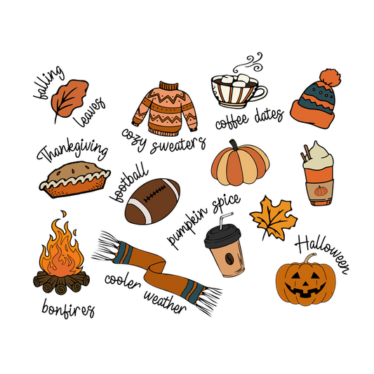 Precio habitual A partir de £0.75 GBPPrecio habitualPrecio unitario / por£2.40 GBPPrecio de oferta A partir de £0.75 GBPUna colorida ilustración con temática otoñal que presenta calabazas, pasteles, ramas de canela, suéteres acogedores y varios accesorios de temporada en forma de corazón.