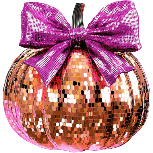 Una glamorosa calabaza con lentejuelas en oro rosa, adornada con un lazo rosa vibrante, perfecta para una decoración festiva.