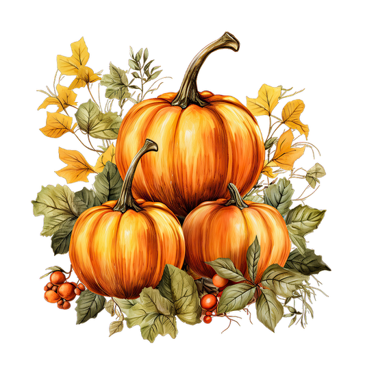 Una encantadora ilustración que presenta tres calabazas de color naranja vibrante rodeadas de hojas y bayas otoñales, perfectas para la decoración de otoño.
