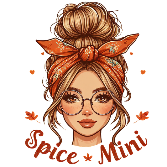 Una elegante ilustración de una mujer con un moño y una diadema naranja, que presenta el texto "Spice Mini" en un diseño divertido.