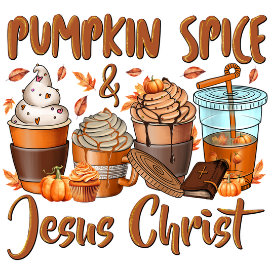 Una ilustración caprichosa que presenta varias delicias con especias de calabaza, incluidas tazas de café, postres y símbolos de fe.