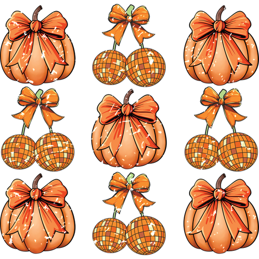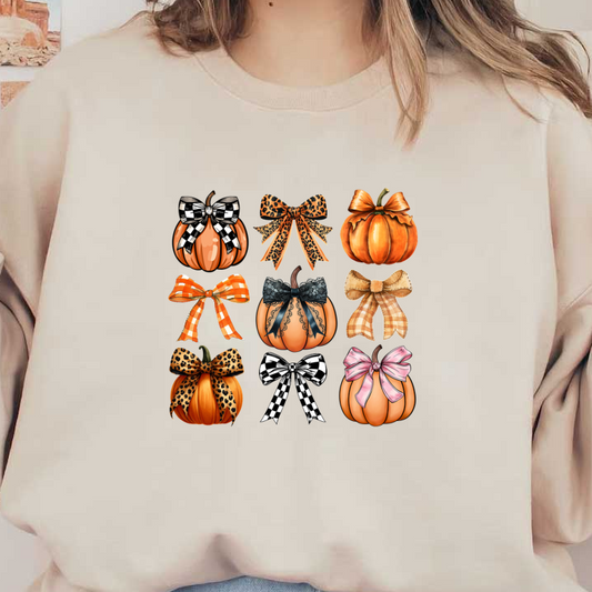 Una alegre colección de calabazas adornadas con varios lazos elegantes, que muestran colores otoñales y patrones divertidos perfectos para la decoración de temporada.