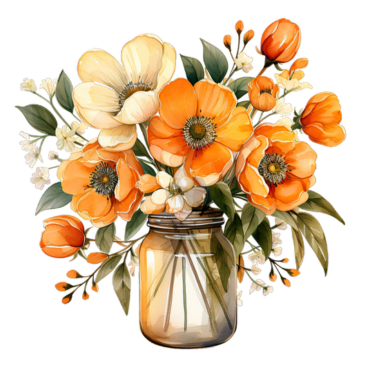 Un hermoso arreglo de flores naranjas y blancas en un frasco de vidrio, rodeado de exuberantes hojas verdes y delicadas flores.