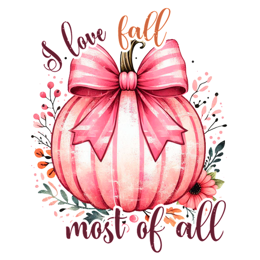 Encantadora ilustración con temática otoñal que presenta calabazas rosas adornadas con un lazo y rodeadas de coloridas hojas otoñales.