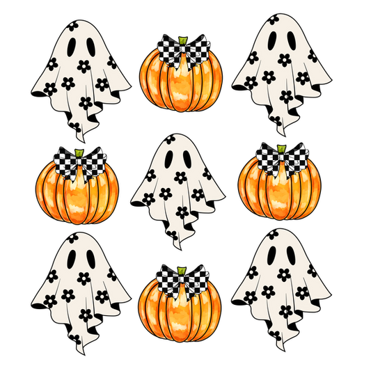 Una divertida ilustración con temática de Halloween que presenta alegres fantasmas y calabazas adornadas con lazos a cuadros y patrones florales.