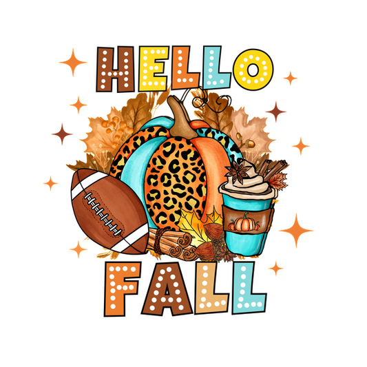 Un gráfico colorido con temática de otoño que presenta una calabaza con estampado de leopardo, una pelota de fútbol, hojas de otoño y una bebida de temporada con la frase "Hola otoño".