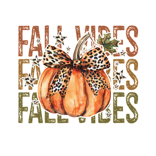 Una vibrante ilustración con temática otoñal que presenta una calabaza con lazo con estampado de leopardo y el texto "Fall Vibes" en tonos tierra.