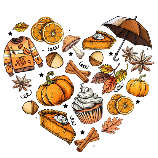 Una colorida ilustración con temática otoñal que presenta calabazas, pasteles, ramas de canela, suéteres acogedores y varios accesorios de temporada en forma de corazón.