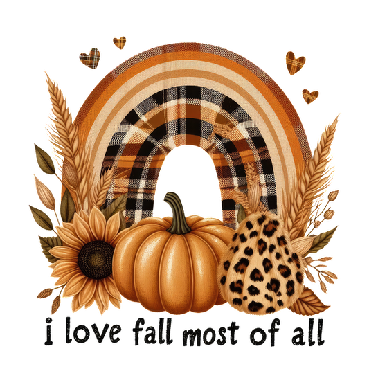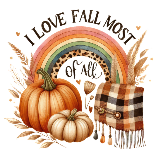 Una ilustración festiva con temática de otoño que presenta calabazas, una acogedora bufanda a cuadros y un arcoíris colorido con la frase "Amo el otoño sobre todo".
