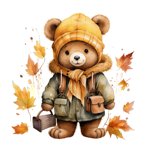 Un lindo osito de peluche vestido con un gorro amarillo y una chaqueta cálida, rodeado de hojas de otoño y sosteniendo pequeñas bolsas.