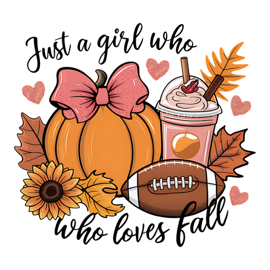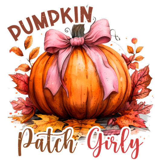 Encantadora ilustración con temática otoñal que presenta una calabaza decorativa adornada con una cinta, rodeada de hojas y el texto "Autumn Girl".