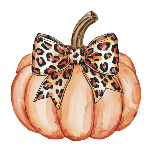 Celebre la temporada con este vibrante gráfico de calabaza que presenta un elegante lazo con estampado de leopardo y detalles florales.