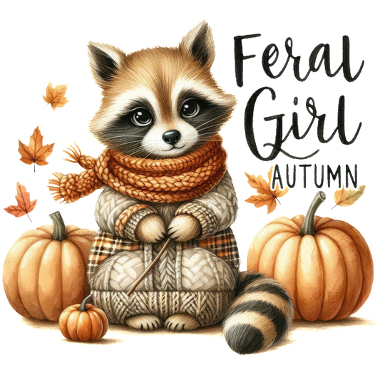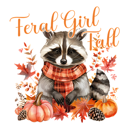 Un simpático personaje de mapache vestido con un atuendo acogedor con calabazas y hojas de otoño, que encarna el tema "Feral Girl".
